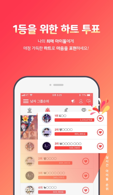- 아이돌 순위 또는 아이돌 커뮤니티 게시물에 하트를 투표하여 실시간으로 순위 결정