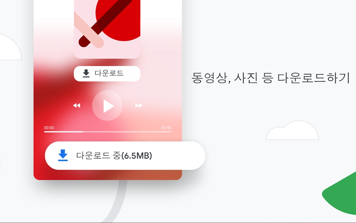 빠른 다운로드 및 웹페이지와 동영상 오프라인 감상: Chrome에는 전용 다운로드 버튼이 있어서 동영상, 사진, 웹페이지 전체를 탭 한 번으로 쉽게 다운로드할 수 있습니다. 또한 오프라인 상태일 때도 Chrome에 내장된 다운로드 홈에서 다운로드한 모든 콘텐츠에 액세스할 수 있습니다.