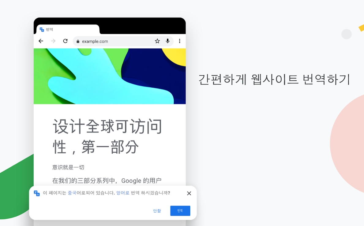 Google 번역 내장: 간편하게 웹페이지 전체를 번역하세요. Chrome에는 Google 번역이 내장되어 있어서 탭 한 번이면 어떤 웹페이지든 내가 사용하는 언어로 번역할 수 있습니다.
