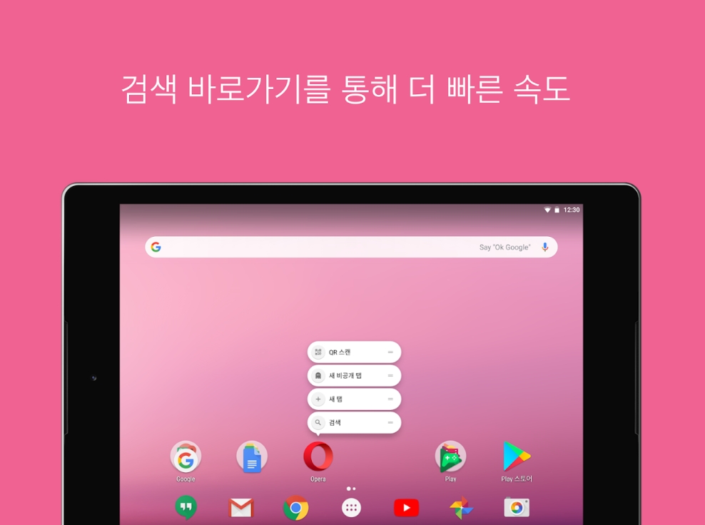 Android 버전 7.1 이상에서 사용할 수 있는 Opera 브라우저는 홈 스크린에서 검색, 새 비공개 탭 열기 또는 QR 코드 스캔 기능에 쉽게 접근할 수 있습니다. 사용자 맞춤 홈 스크린 바로가기를 생성하려면, 사용 기기 홈 스크린의 Opera 아이콘을 길게 탭한 후 원하는 기능을 탭하십시오.