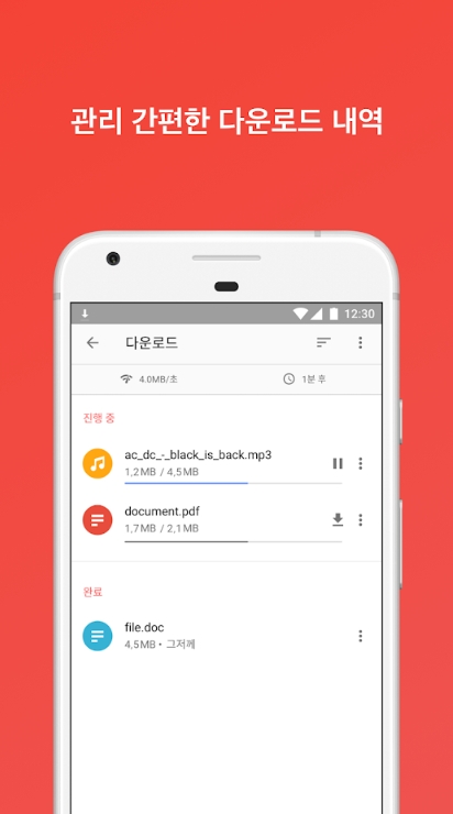 다운로드 관리 기능을 통해 그 어느 때보다 더 쉽고 빠르게 파일을 다운로드할 수 있습니다! 각각의 다운로드 아이템을 쉽게 분류 및 공유하고, 오른쪽에서 왼쪽으로 밀어서 스마트폰에서 삭제하거나 다운로드 목록에서 빠르게 제거할 수 있습니다. 다운로드 중 백그라운드 다운로딩 기능도 제공하지만 앱을 하나 더 열어야 합니다!
